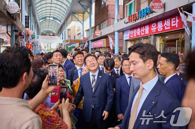 (서울=뉴스1) 박지혜 기자 = 이재명 대통령이 20일 울산 울주군 언양알프스시장을 방문하고 있다. (대통령실 제공. 재판매 및 DB 금지) 2025.6.20/뉴스1
