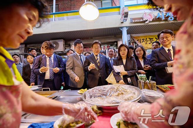 (서울=뉴스1) 박지혜 기자 = 이재명 대통령이 20일 울산 울주군 언양알프스시장을 방문해 튀김 등 분식을 주문하고 있다. (대통령실 제공. 재판매 및 DB 금지) 2025.6.20/뉴스1