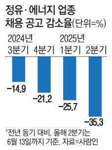 정유·석유화학 업황 부진이 길어지면서 그 여파가 채용 시장에도 뚜렷하게 나타나고 있다. 채용 공고가 3년째 줄고 있는데 올해 2분기에는 사상 최대 감소폭을 기록할 정도다.
