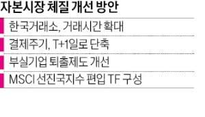 MSCI 선진국지수 편입을 위한 로드맵도 하반기에 나온다. 이달 기획재정부 금융위 한국은행 금융감독원 한국거래소 예탁결제원 등 관계기관과 주요 금융사들이 참여하는 민관 합동 태스크포스(TF)를 구성하기로 했다. MSCI 선진국지수에 포함되면 이 지수를 따라가는 글로벌 자금이 유입되는 효과를 볼 수 있다.