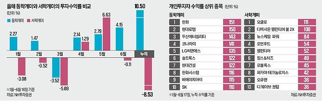 국내 주식에 투자하는 동학개미의 수익률이 올해 들어 미국 주식을 매매하는 서학개미를 압도하고 있다.