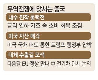 또 중국은 미국을 대체할 수출길 확보에도 공을 들이고 있다. 동남아시아국가연합(아세안·ASEAN)과 남미, 중동 등으로 수출을 확대하는 동시에 유럽연합(EU)과 미국 관세 정책에 대한 공동 대응 방안도 모색하고 있다. 우르줄라 폰데어라이엔 EU 집행위원장과 안토니우 코스타 EU 정상회의 상임의장은 다음달 24~25일 베이징을 방문해 시진핑 중국 국가주석과 만날 예정이다. 중국이 독점하고 있는 희토류에 관한 협의와 함께 중국산 전기차 관세 문제도 논의할 전망이다.