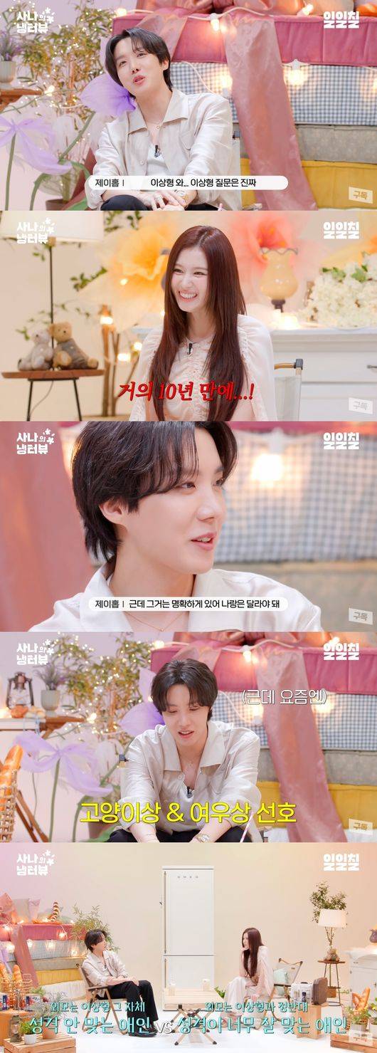 사나는 제이홉에게 이상형을 물었고, 제이홉은 "이상형 질문 10년 만에 받아본다"며 당황해 했다.