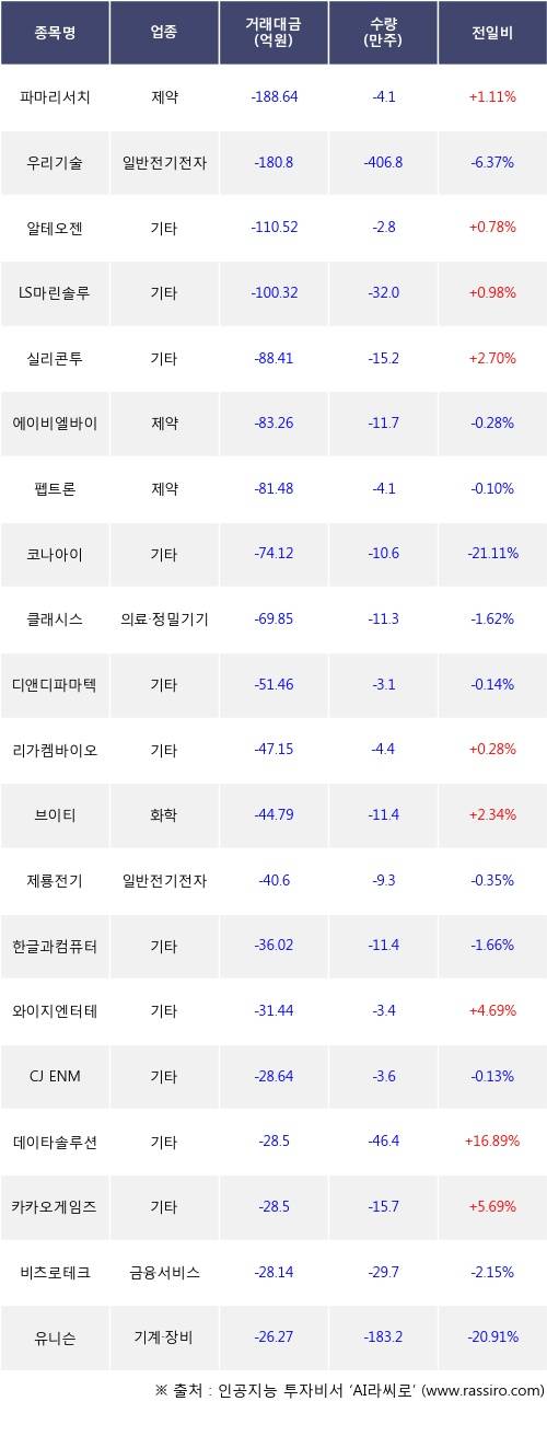 외국인 투자자의 순매도 상위 20개 종목은 파마리서치, 우리기술, 알테오젠, LS마린솔루션, 실리콘투, 에이비엘바이오, 펩트론, 코나아이, 클래시스, 디앤디파마텍등이다.