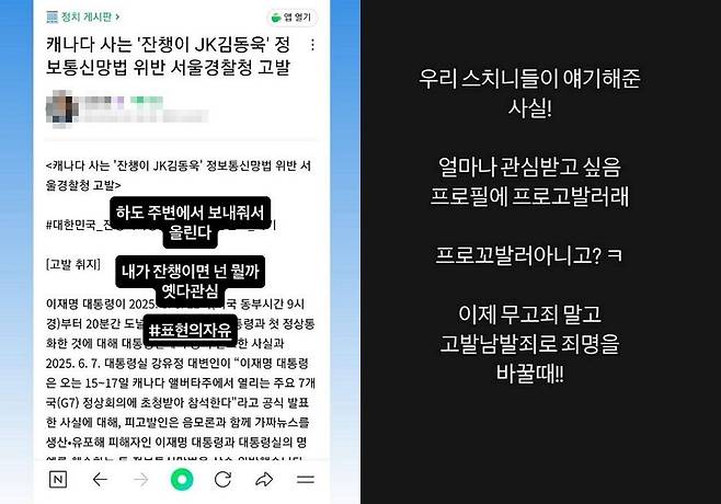 해당 글에는 '캐나다 사는 잔챙이 JK김동욱 정보통신망법 위반 서울경찰청 고발'이라는 제목으로 고발 취지 등이 적혀있다.
