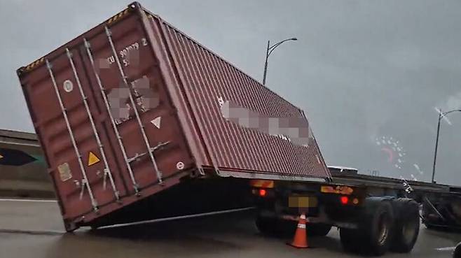 또, 컨테이너가 편도 3차로 도로의 2개 차로를 가로막으면서 일대에 극심한 차량 정체가 빚어지고 있습니다.