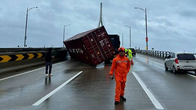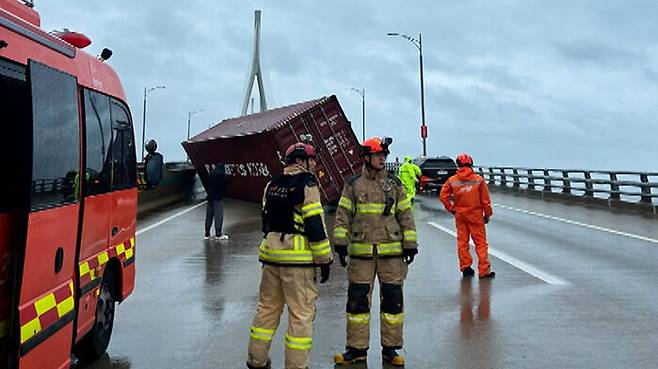 강풍 속 인천대교 달리던 차량서 컨테이너 떨어져…2명 부상