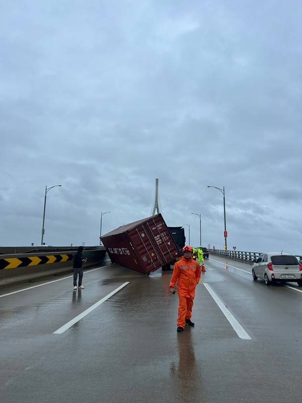 또 컨테이너가 떨어지면서 편도 3차로 도로의 2개 차로를 가로막아 일대가 극심한 차량 정체가 빚어지고 있다.