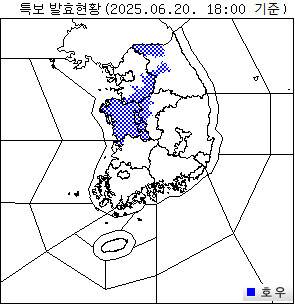 기상청은 20일 “일부 수도권과 강원 북부 내륙, 충남권을 중심으로 호우특보가 발효된 가운데, 20~21일 사이 매우 강한 비가 내리는 곳이 있을 것”이라고 밝혔다. 매우 강한 비가 예보된 지역과 시간당 강수량은 20일 저녁까지 수도권(30㎜ 안팎), 20일 밤~21일 새벽 사이 강원 내륙(30㎜ 안팎), 충북 중·북부(30~50㎜), 대전·충남 남부(30~50㎜), 세종·충남 북부(30~50㎜) 등이다. 전북에는 20일 밤부터 시간당 30㎜ 안팎, 광주·전남 북부에는 21일 오전부터 30~50㎜, 전남 남부에는 21일 오전부터 30㎜ 안팎의 비가 내릴 전망이다. 경북, 경남 서부 내륙 등에서도 21일 새벽부터 30~50㎜의 비가 온다.