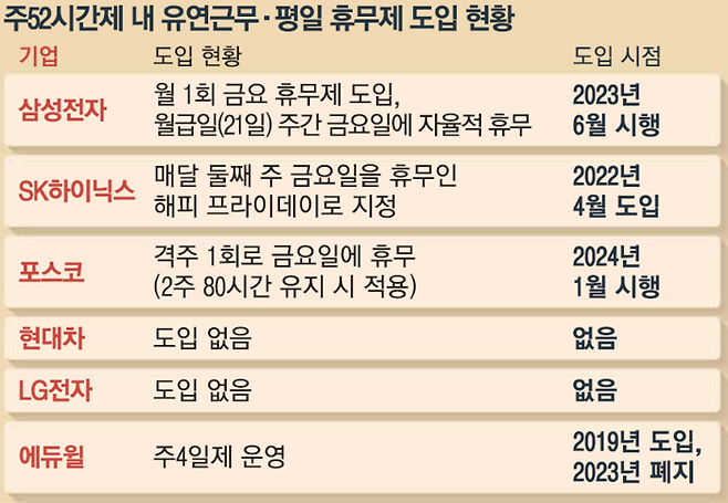 실제로 일부 대기업들은 자체 노사 합의에 따라 근로시간을 자율적으로 조정하고 있다.