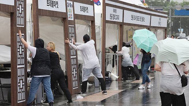 ▲ 서울에 호우주의보가 내려진 20일 서울 청계광장에서 열린 한 행사장에서 관계자들이 강한 비바람이 불자 시설물을 잡고 있다.
