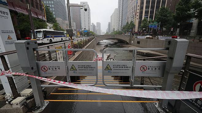 ▲ 서울 전역에 호우주의보가 내려진 20일 서울 청계천 산책로 출입이 통제되고 있다.