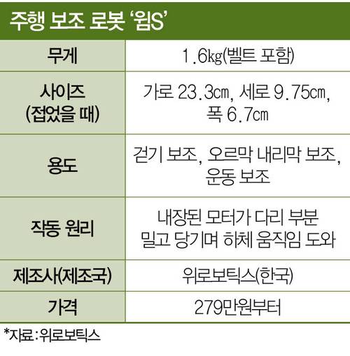 그 희망을 실현해주는 이가 있다. 사람이 아닌 웨어러블(몸에 착용하는) 로봇이다. 미래학자들은 ‘1인 1로봇’ 시대를 예견하지만, 아직 현실감 있게 다가오는 얘기는 아니다. ‘입는’ 로봇 효과를 알아보기 위해 위로보틱스 ‘윔(WIM)S’를 직접 차봤다. 위로보틱스는 삼성전자 로봇 연구원 출신들이 2021년 창업한 스타트업이다. ‘윔S’는 허리춤에 주머니를 차듯 로봇이 달린 밴드를 둘러 고정한다. 여기에 게 다리처럼 연결된 관절 부분을 양복 허벅지에 착용하면 끝이다. 윔S는 허리춤에 찬 모터를 이용해 움직임을 도와준다. 모터 무게는 벨트를 포함해 1.6㎏. 묵직한 내용물이 담긴 히프색을 착용한 정도의 느낌이다. 위로보틱스 측은 “보행 능력이 저하된 시니어층과 험한 곳을 오래 걸어야 하는 군인, 위험 지대에서 높은 체력 수준을 요구하는 소방관에게 좋다”고 설명했다.
