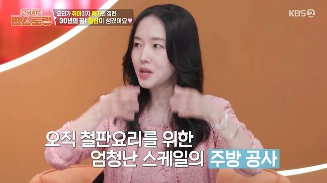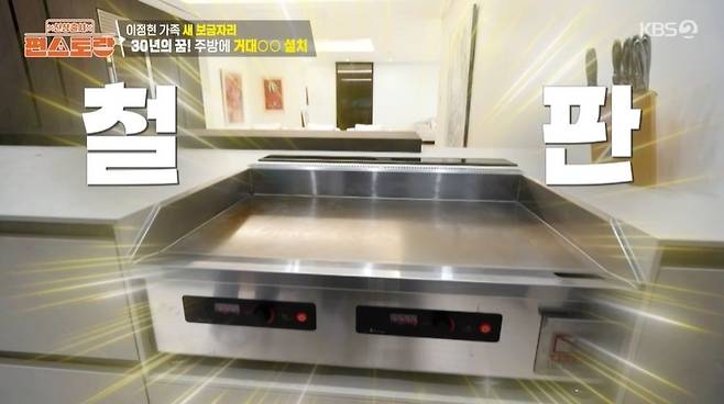 이어 30년 동안 갖고 싶었던 물건이 공개됐다. 바로 철판이었다. 장민호는 "진짜 업장 아니냐. 가정집에서 있는 거 처음 본다"라고 신기해했다. 이정현은 "환풍기 4대가 달려 있다. 그래서 요리할 때 연기가 안 난다. 철판요리를 위해 주방 설계를 다시 했다"라고 설명했다.
