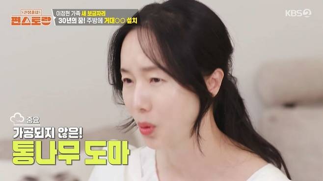 이정현은 대형 사이즈 나무 도마를 애지중지 관리했다. 이정현은 "제가 공장에 찾아가 맞춤 제작했다. 제가 업자인 줄 알더라. 큰 도마를 너무 갖고 싶었다"라고 고백했다. 도마 욕심이 많다는 이정현은 "도마가 30개 넘는 것 같다. 항상 편백나무 향이 나는 오리지널 통나무 도마를 너무 갖고 싶었다. 칼질할 때 느낌이 너무 좋다. 첫날엔 안방에 놓고 잤다"라며 애정을 드러냈다. 이정현은 "제 부엌에 두니까 너무 행복하다. 평생 쓸 거고, 딸에게 물려줄 거다"라며 행복한 미소를 보였다.