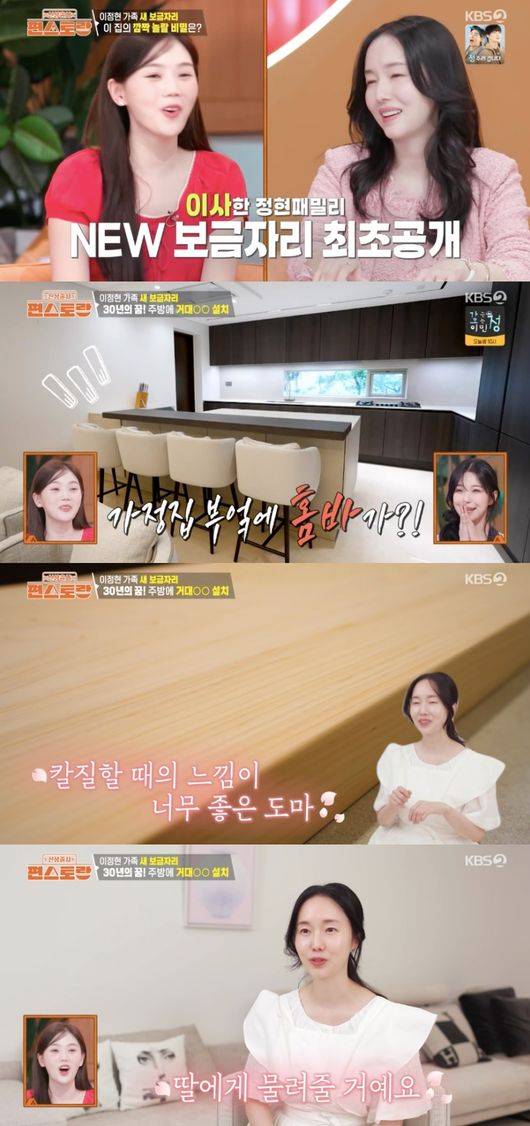 널찍한 거실은 물론 미끄럼틀이 있는 서아방, 서우방에 이어 이 집의 하이라이트 주방까지 선보였다. 주방에는 넓은 식탁부터 바 테이블까지 있었고, 이정현은 “이번에 가족들이랑 마주보고 식사하고 싶어서 바테이블 만들었다”라고 설명했다. 이를 본 이연복은 “주방만 딱 봐도 진짜 요리 사랑하는 사람이다”라고 감탄했다.