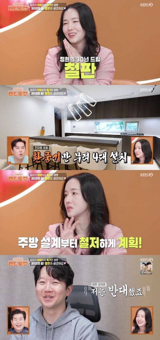 특히 이정현은 “30년 동안 소원이었다. 너무 갖고 싶었다”라며 식당에서나 볼 수 있는 요리용 철판을 선보여 눈길을 끌었다. 이정현은 “이 요리를 정말 제대로 하고 싶어서 30년 전부터 철판을 갖고 싶었다. 저것도 공장에서 맞췄다. 환풍기 4개를 설치했다. 밑, 위, 옆, 뒤 다 있다. 부엌 설계를 다 다시했다. 기본 설계부터 환풍기 다 천장 다 뜯었다. 철판요리를 위한 곳이다”라고 설명했다.