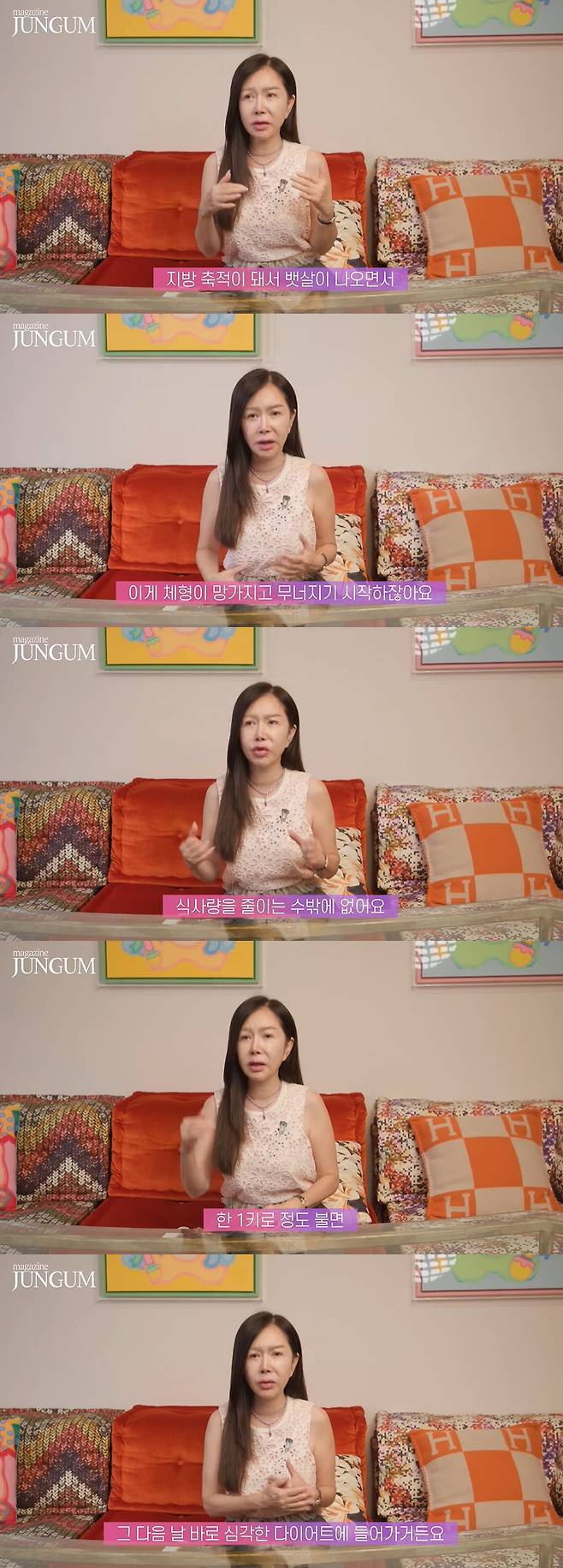 박준금은 뱃살 관리 비법을 묻는 질문에 "지방 축적이 돼서 뱃살이 나오면서 체형이 망가지고 무너지기 시작한다. 그럴 때는 무조건 식사량을 줄이는 수 밖에 없다. 한 1kg 정도 불면 그 다음날 바로 심각한 다이어트에 들어간다"며 자신만의 비법을 공유했다.