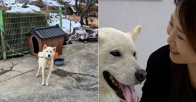 “지난겨울 이웃 공장을 지나가는데 뼈만 남은 백구가 묶여 있었어요. 밥그릇에는 얼음만 얼어있을 뿐 먹을 게 전혀 없었어요. 아무래도 밥 주는 사람이 없는 것 같아서 사료를 챙겨와서 부어줬어요. 그랬더니 허겁지겁 먹다가 구역질을 하더군요. 얼마나 굶었으면…. 가엾어서 그 뒤로 매일 사료를 챙겨줬는데 아무리 둘러봐도 저 말고는 돌보는 사람이 없었어요. 2주일이 지나서야 잔반을 들고 오는 견주를 만났습니다.”