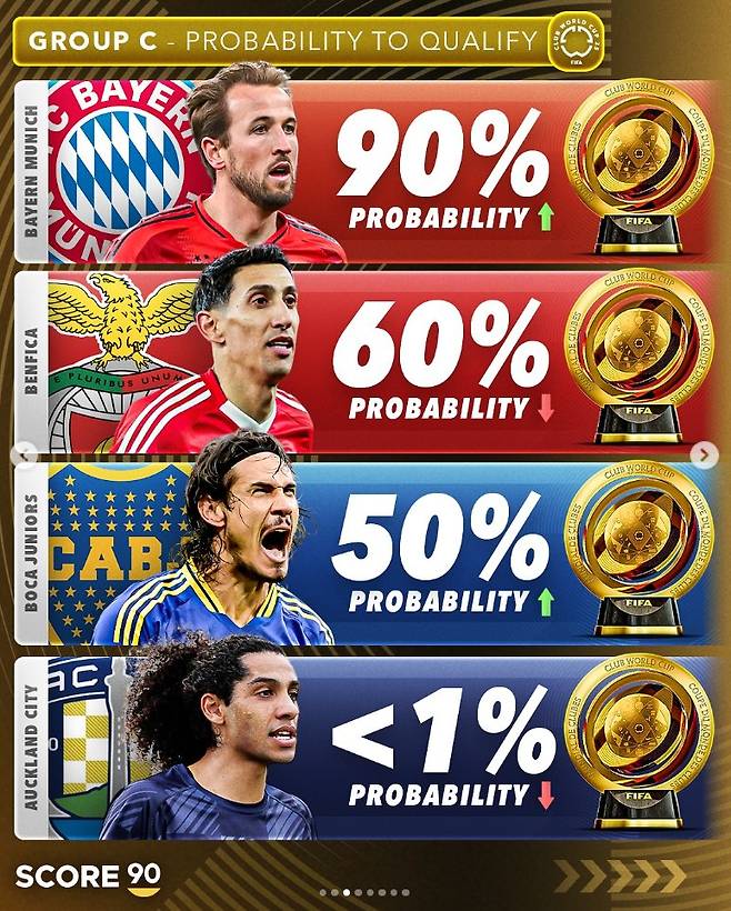 글로벌 축구매체 '스코어90'은 20일(한국시간) 사회관계망서비스(SNS)를 통해 "최신 확률에 따른 클럽 월드컵 조별리그 예선 통과 확률"이라고 보도했다.