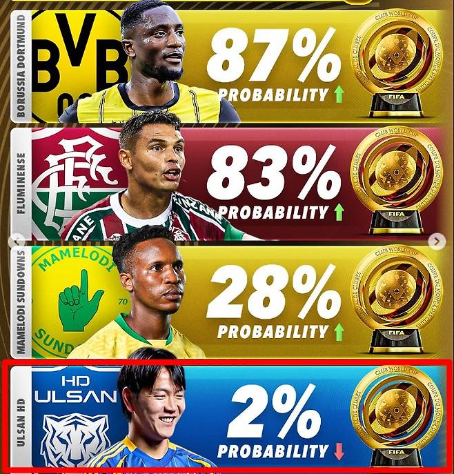 울산HD가 현재 참가 중인 2025 국제축구연맹(FIFA) 클럽월드컵에서 토너먼트에 진출할 확률이 겨우 2%인 것으로 드러났다.