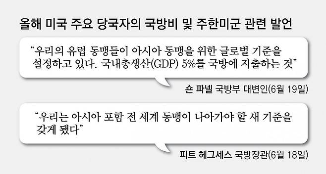 트럼프 대통령은 취임 직후 나토에 국방비 지출 기준을 기존 GDP 대비 2%에서 5%로 올릴 것을 요구해 왔다. 다만 집단안보체제를 구축하고 있는 나토와 달리 한미 상호방위조약 같은 양자 안보협정을 맺은 한국과 일본 등 아시아 동맹국에 국방비 지출 기준을 요구한 것은 처음이다.
