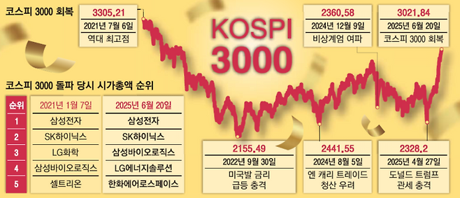 최초로 3000선을 돌파했던 2021년 1월 7일 삼성전자의 시총은 495조원이었는데 현재는 352조원에 그치고 있다. 반면 SK하이닉스는 98조원에서 197조원으로 늘어났고 한화에어로스페이스(44조원) 등 새로운 주도주와 업종이 등장했다.