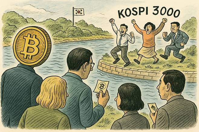 "축제다" 환호성 지르는 코스피…바다 건너 구경하는 비트코인, 왜?