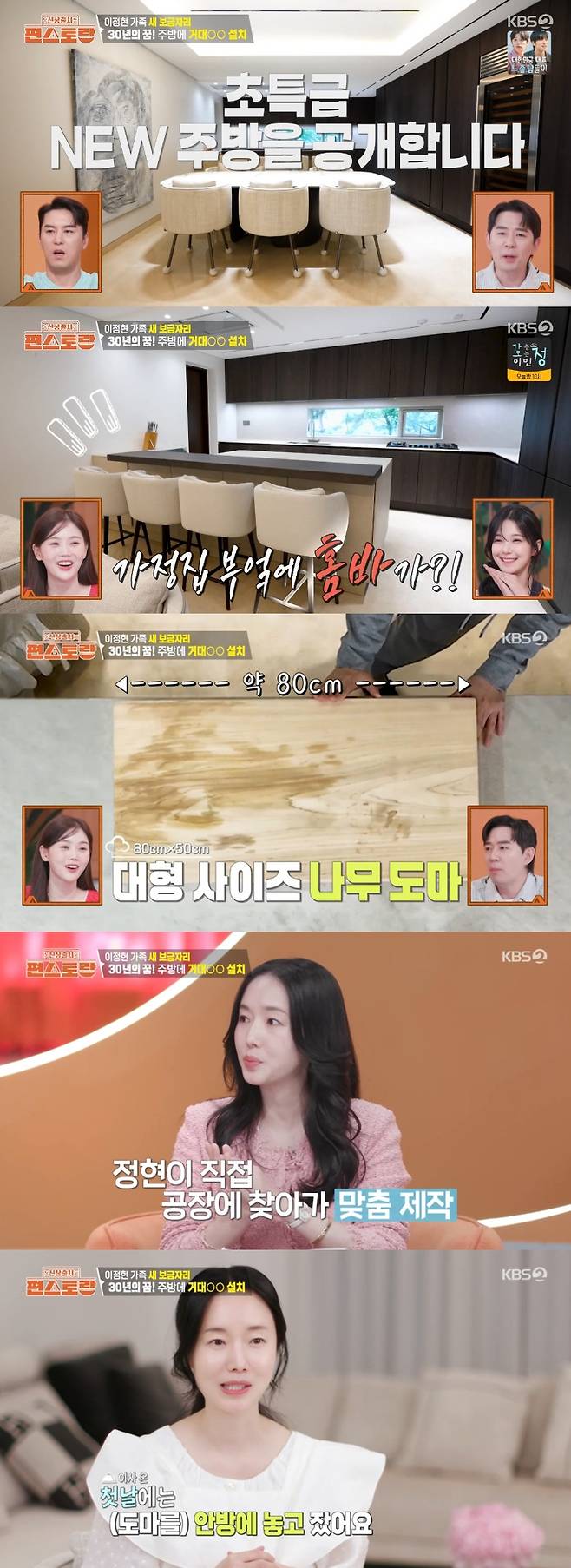 서랍장 가득한 접시와 찻잔들, 그리고 다양한 요리 도구들에 이연복은 "주방만 딱 봐도 진짜 요리를 사랑하는 사람의 주방이다"라며 감탄했고, 이어 이정현은 약 80cm의 초대형 도마를 꺼내 들어 눈길을 끌었다.