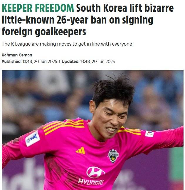 매체는 "한국 최고 축구 리그에서 외국인 골키퍼에 대해 26년간 이어진 출전 금지 조치가 2026년 시즌부터 삭제됐다"며 "1999년부터 아시아에서 가장 오래된 프로 국내 리그인 K리그에서 뛰는 것은 오직 한국 골키퍼 뿐이다"라고 밝혔다.