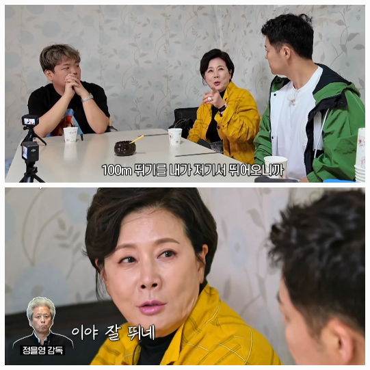 "100m를 뛰는 나를 보고 바깥분이 '잘 뛴다'고 하더라"며 사실혼 관계인 정경호 아버지, 정을영 감독과의 소소한 일화도 함께 전했다.