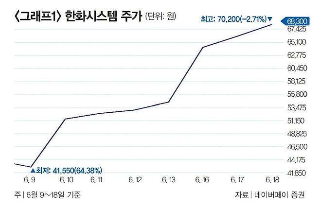 한화시스템은 중동 긴장이 고조되기 시작한 6월 10일부터 7거래일 연속 사상 최고가를 갈아치웠다(그래프1 참조). 한국거래소에 따르면 한화시스템은 6월 18일 전 거래일 대비 3.17% 오른 6만8300원에 장을 마쳤다. 9일 종가(4만2800원) 대비로는 약 59.58% 상승한 수치다.