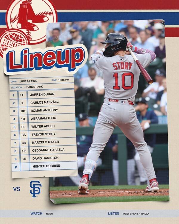 한편, 샌프란시스코를 상대하는 보스턴 레드삭스는 제런 듀란(좌익수)-카를로스 나르바에스(포수)-로만 앤서니(지명타자)-에이브러햄 토로(1루수)-윌리어 아브레유(우익수)-트레버 스토리(유격수)-마르셀로 마이어(3루수)-세단 라파엘라(중견수)-데이비드 해밀턴(2루수) 순으로 라인업을 짰다. 선발 투수는 헌터 도빈스다.