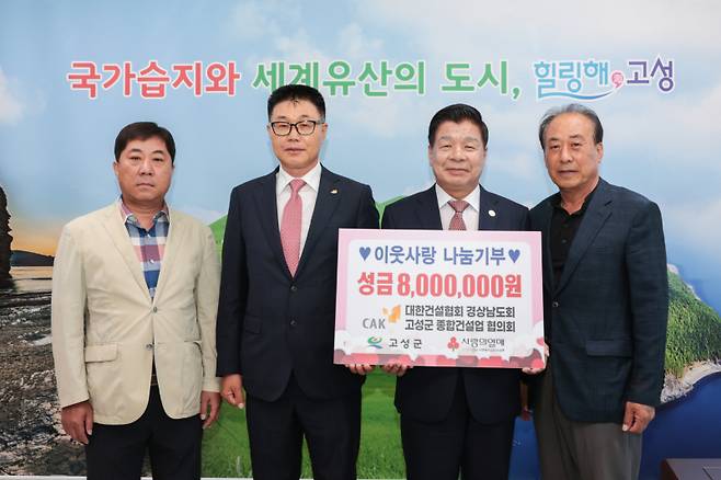 이상근 고성군수는 “대한건설협회 경상남도회와 고성군 종합건설업 협의회의 지속적인 나눔과 따뜻한 관심에 감사드린다.”며 “성금은 고성군의 어려운 이웃을 위해 소중히 전달하겠다”고 말했다.