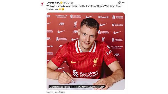 리버풀은 20일(현지시간) "독일 바이어 레버쿠젠과 비르츠의 이적에 합의했다"면서 "비르츠는 개인 조건에 동의하고 메디컬 테스트를 성공적으로 통과한 뒤 장기 계약에 서명했다"고 발표했습니다.