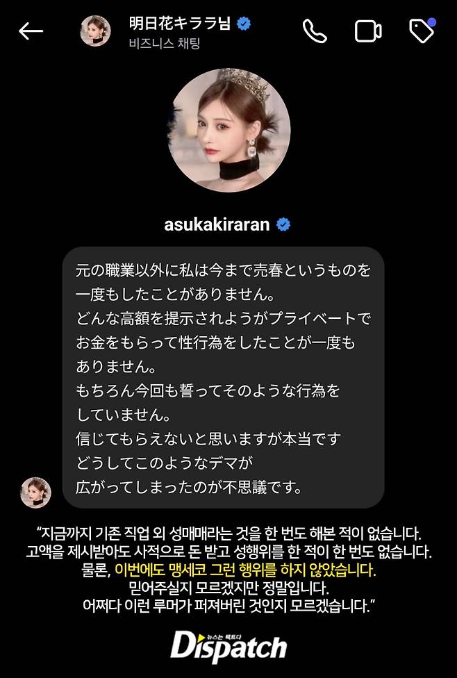 마지막으로, '디스패치'는 아스카 키라라와 DM을 나눴다. 그는 처음에는 "지금까지 직업적인 부분을 제외하고, 성매매를 한 번도 해본 적이 없다. 어떤 고액을 제시하든, 사적으로 돈 받고 성행위를 한 적이 없다"고 선을 그었다.