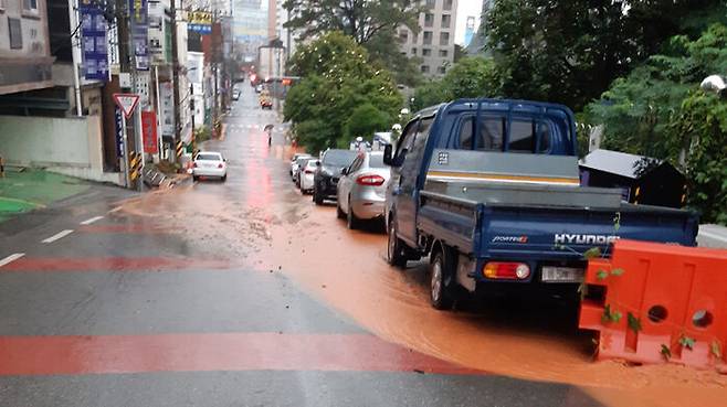 ▲ 정체전선이 남하해 폭우가 쏟아지는 21일 오전 광주 서구 쌍촌동 한 도로에 인근 공사장 토사가 빗물을 타고 유출되고 있다.