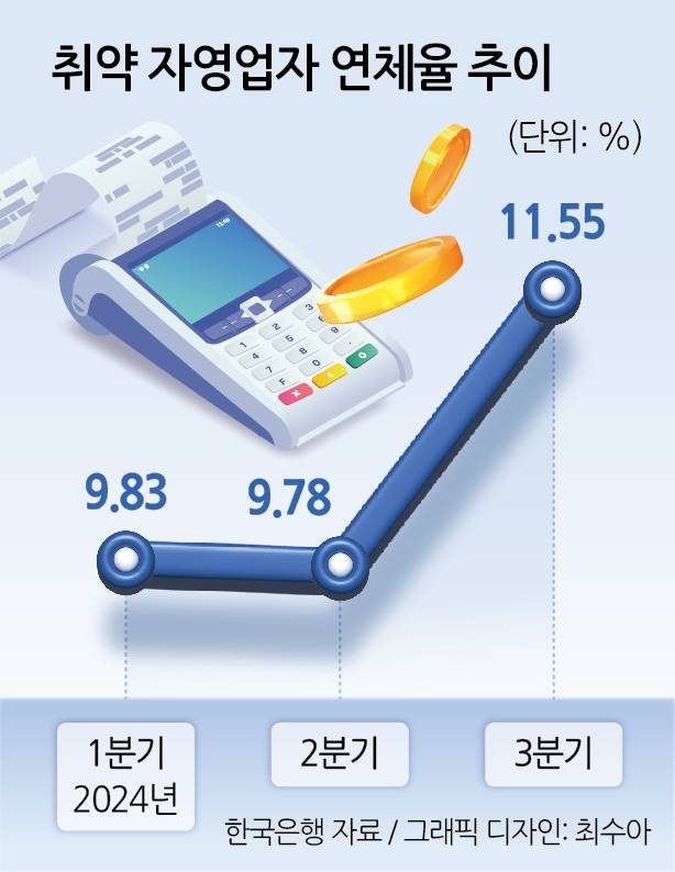 하지만 시대가 지나도 취약 차주의 연체율은 개선되지 않고 있다. 한은에 따르면 오히려 ‘취약 자영업자’ 대출 연체율은 지난해 3분기 기준 11.55%로, 2013년 3분기(12.02%) 이후 11년 만에 최고치를 기록했다.