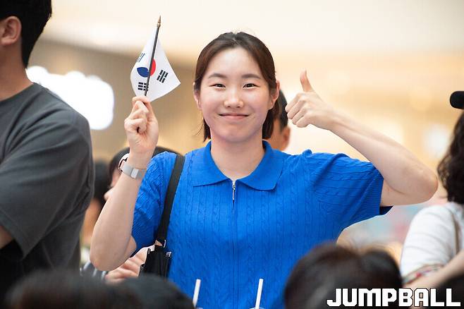 쇼핑 목적으로 스타필드를 찾은 이들이 발걸음을 멈추고 코트로 시선을 돌린 가운데 태극기를 흔들고 있는 김지영의 모습도 볼 수 있었다. 김지영은 WKBL 시즌이 끝나면 종종 KBL, 3x3를 현장에서 관전하는 등 취미조차 ‘농구 보기’인 선수다.