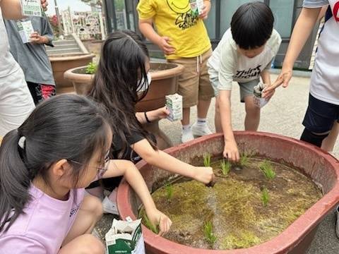 | ▲ 학생들은 우유팩에 볍씨를 심어 만든 모판으로 모내기를 했다. 대야에 물을 채워 작은 논을 만들고, 생명의 성장 과정을 직접 체험하기 위해서다. |