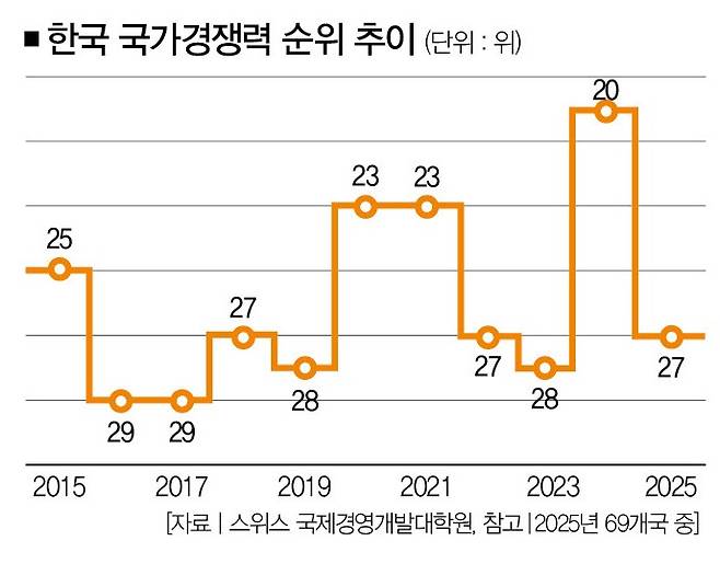 스위스 국제경영개발대학원(IMD)의 2025년 국가경쟁력 평가에서 한국이 69개국 중 27위에 그쳤다. 역대 최고였던 지난해 20위에서 7계단 떨어졌다. 매해 공개되는 기업인 대상 설문조사 결과이긴 해도 나라 밖에서 이렇게 바라본다는 점이 신경 쓰인다. 더구나 같은 아시아권 경쟁국인 홍콩은 3위, 대만이 6위, 중국도 16위로 한참 위에 랭크돼 있다.