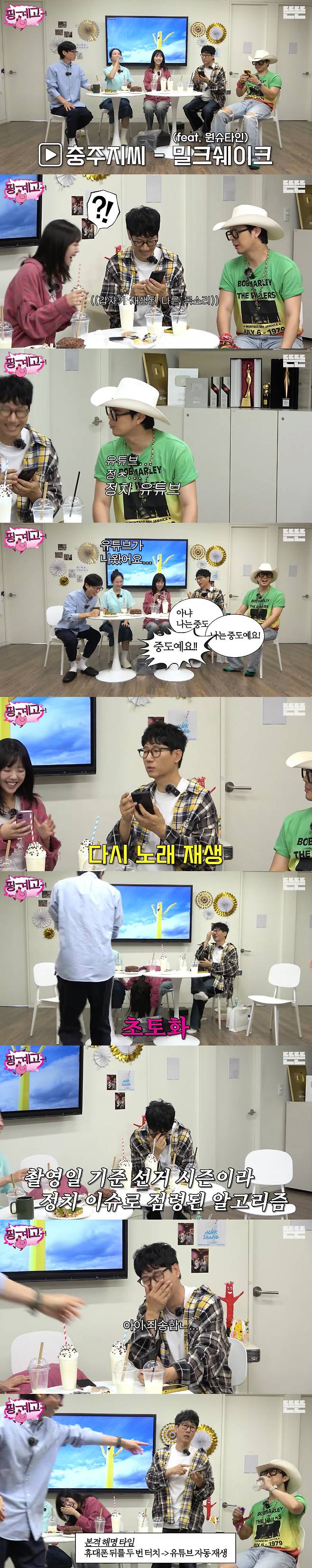 문제는 끊긴 영상 직후 유튜브 알고리즘에 의해 정치 관련 콘텐츠가 자동 재생된 것. 이를 본 하하는 "정치 유튜브가 떴다. 형 색깔을 알아버렸다"며 농담을 던졌고, 지석진은 당황한 표정으로 "아니다. 나는 중도다!"라고 급히 해명했다. 유재석도 "정치 유튜브가 나오냐. 죄송하다. 괜한 억측과 오해 없으시길 바란다"며 현장을 수습했다.