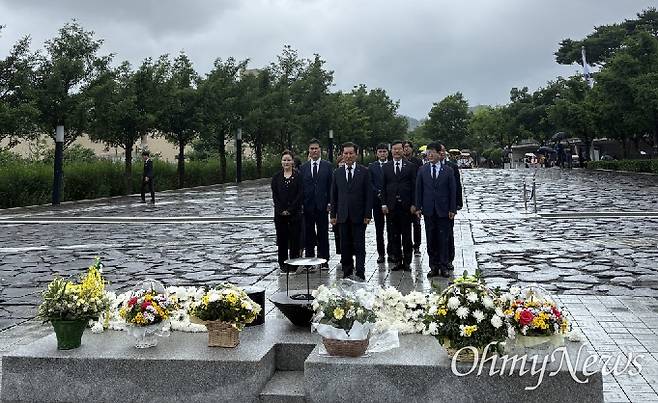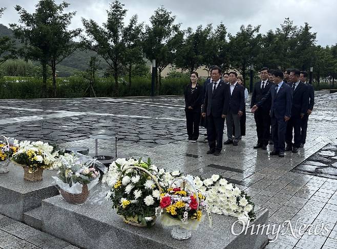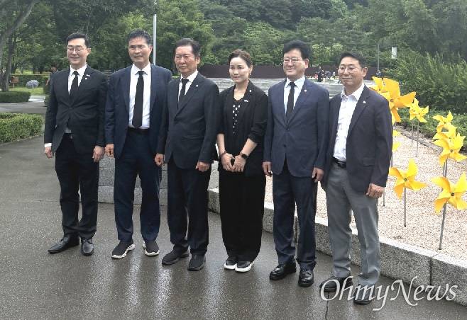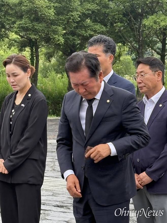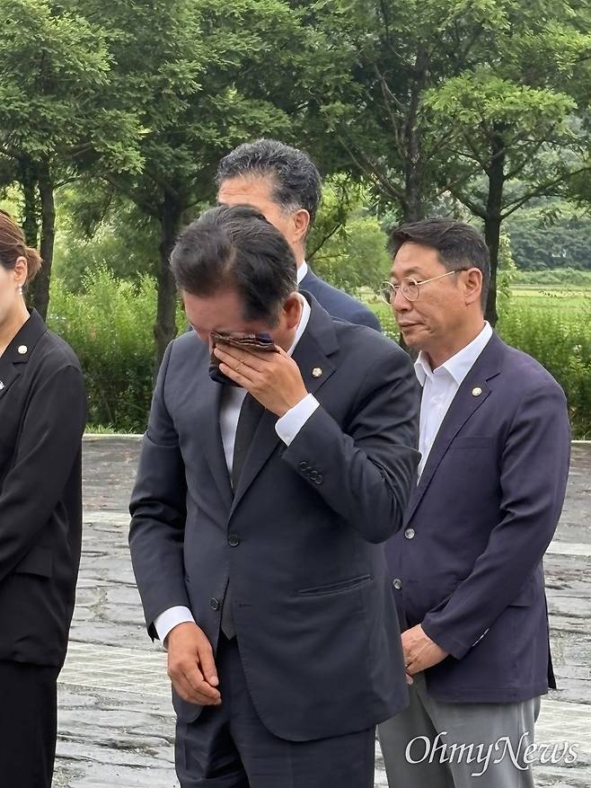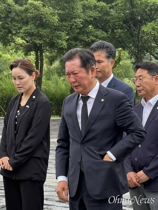 정청래 의원은 참배하면서 눈물을 보였고 손수건을 꺼내 닦기도 했다.