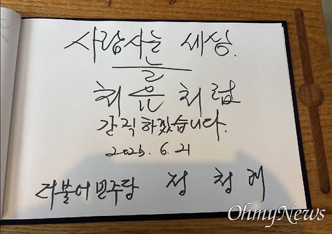| ▲ 더불어민주당 당대표 선거에 나선 정청래 의원이 21일 오후 김해 봉하마을을 방문해 고 노무현 대통령 묘소를 참배하고 쓴 참배록. |