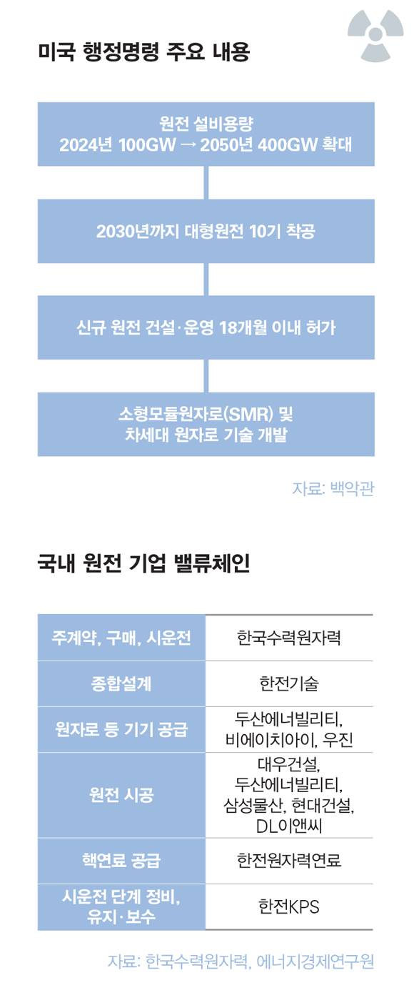 미국이 원전산업 재건에 시동을 걸면서 업계에서는 한국전력(한전), 한국수력원자력(한수원) 등 원전 수출 경험이 있는 국내 기업의 미국 진출 가능성이 거론된다. 우선 트럼프 대통령이 명시한 '2030년까지 대형원전 10기 착공' 목표를 달성할 능력을 갖춘 글로벌 기업이 많지 않기 때문이다. 1950년대 원전산업 선두주자였던 미국 웨스팅하우스(Westinghouse)가 주도권을 확보할 가능성도 있지만, 웨스팅하우스는 현재 폴란드, 우크라이나, 불가리아 등에서 프로젝트를 수행하고 있어 미국 내 원전 건설 프로젝트를 단독으로 진행하긴 어려운 상황이다.