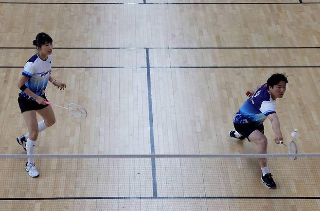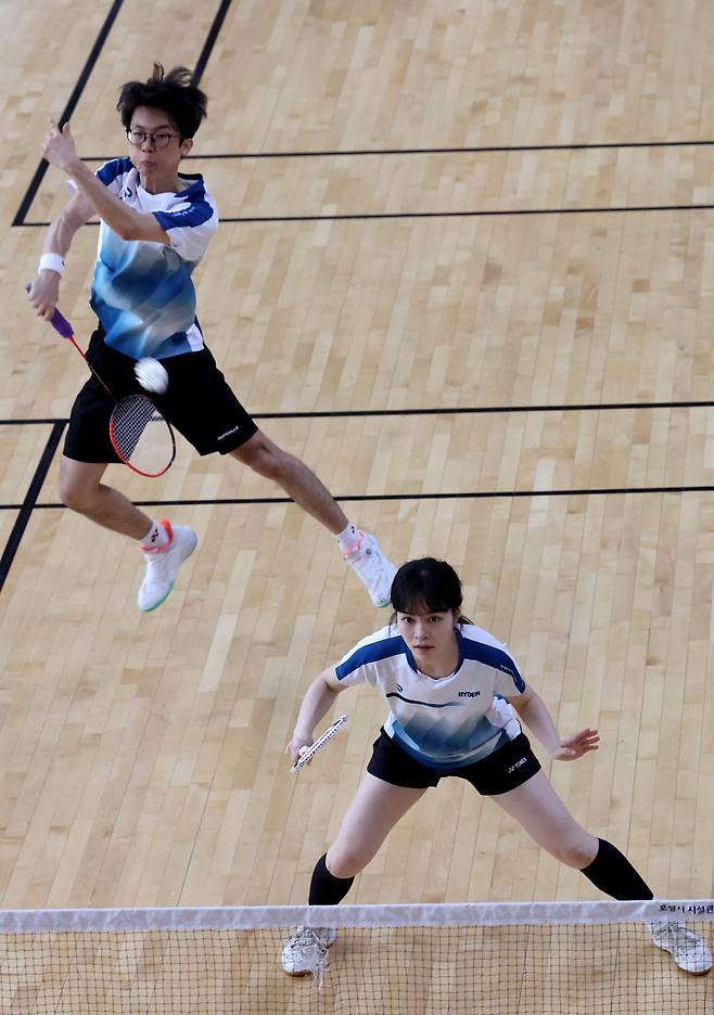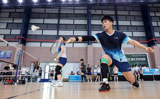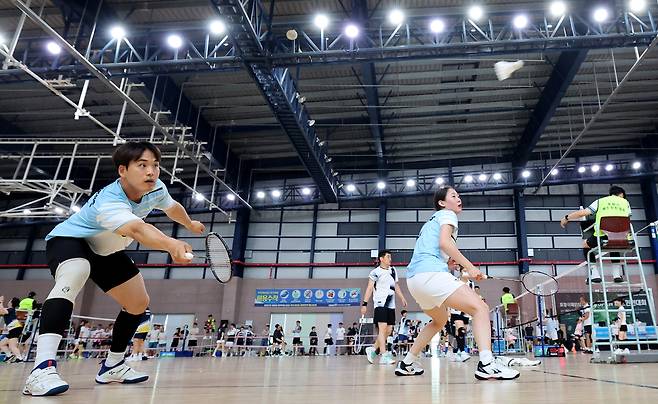 경북매일신문이 주최하고 포항시 배드민턴협회가 주관한 ‘2025 포항 국제 불빛 축제 기념 OPEN 배드민턴대회’가 21일 포항 만인당과 실내체육관에서 열렸다. 혼합복식에 출전한 선수들이 치열한 랠리를 이어가고 있다. /이용선기자 photokid@kbmaeil.com