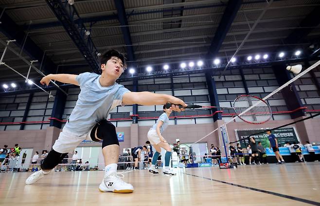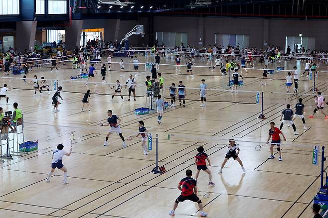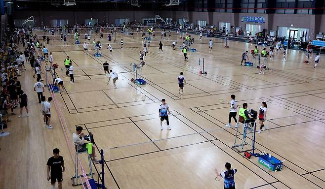 전국각지에서 참석한 배드민턴 동호회원들이 만인당에 마련된 코트에서 평소 갈고닦은 실력을 겨루고 있다.