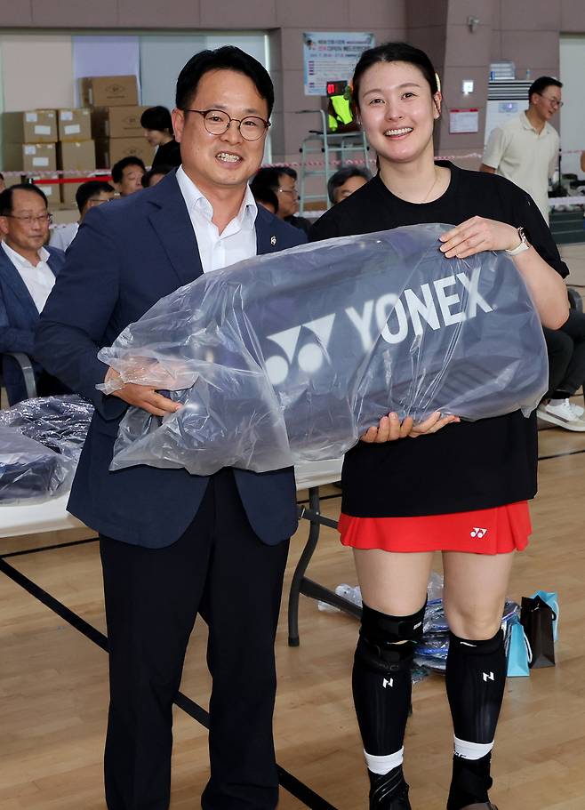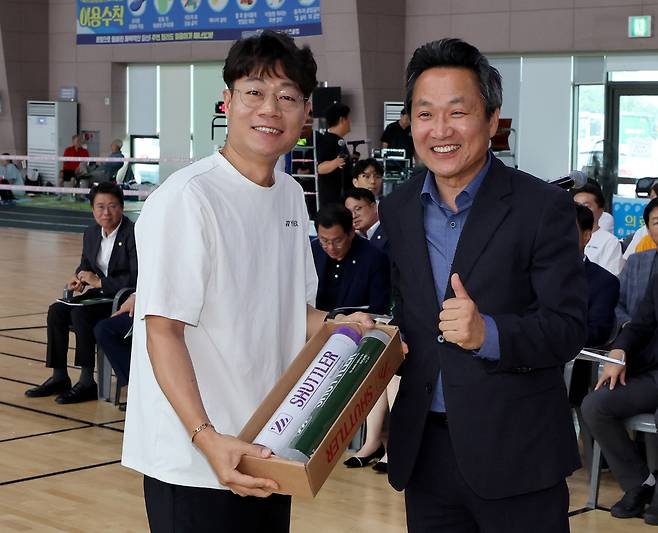 개회식 참석 내빈과 배드민턴 협회 임원들이 황금 팔찌, 목걸이와 다양한 배드민턴용품을 경품 당첨자에게 전달하고 있다.