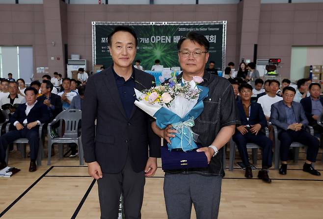 고원학 포항시 남구청장이 배드민턴 발전에 공헌한 포항시 배드민턴 협회 임원에게 감사패를 전달하고 있다.