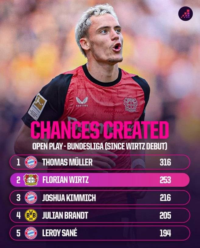 뛰어난 활약을 펼치면서 비르츠는 어린 나이에 분데스리가 최고의 선수 중 한 명으로 떠올랐다. 축구통계매체 '옵타'에 따르면 비르츠가 프로로 데뷔한 후 오픈 플레이 상황에서 비르츠(253개)보다 더 많은 찬스를 만든 선수는 바이에른 뮌헨 레전드 토마스 뮐러(316개) 한 명뿐이다.